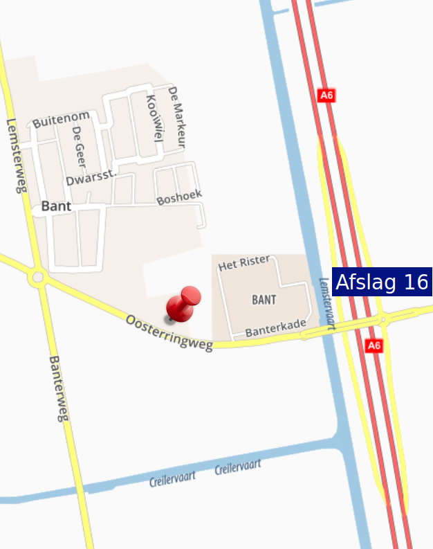 Stalling Bant is gelegen aan de snelweg A6 in de Noordoostpolder. Op een half uur rijden van Lelystad, Zwolle, Heerenveen, Drachten, Joure en Sneek zijn wij voor een groot gebied goed bereikbaar.